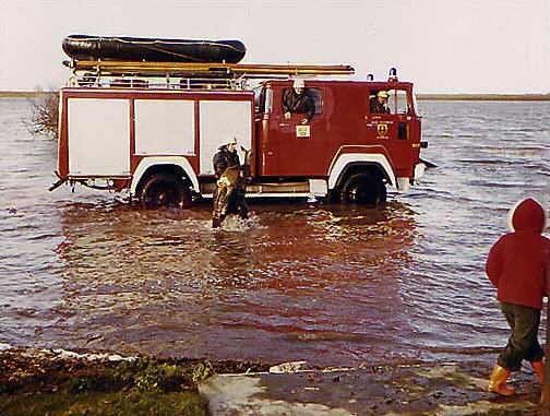 Die Feuerwehr rettet ein Reh vor dem Ertrinken während der Flutkatastrophe 1976 - 700 andere Rehe ertrinken sowie 3000 Fasanen und 1000 Hasen. Die Haseldorfer Marsch ist nach einem Deichbruch mit Wasser vollgelaufen. Wo die Feuerwehr hier steht, war früher die Altendeicher Chaussee und Wiesen dahinter.. Jetzt sieht man nur noch Wasser fast bis zum Horizont.