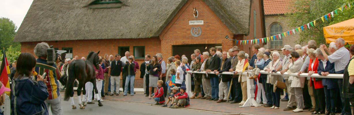 Foto oben: Der Leiter der Haselauer Hengststation, Gunnar Mohr, führt 2006 während der Feierlichkeiten zum 100. Geburtstag der Hengststation den Hengst Contender einem interessierten Publikum vor.