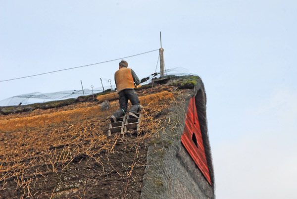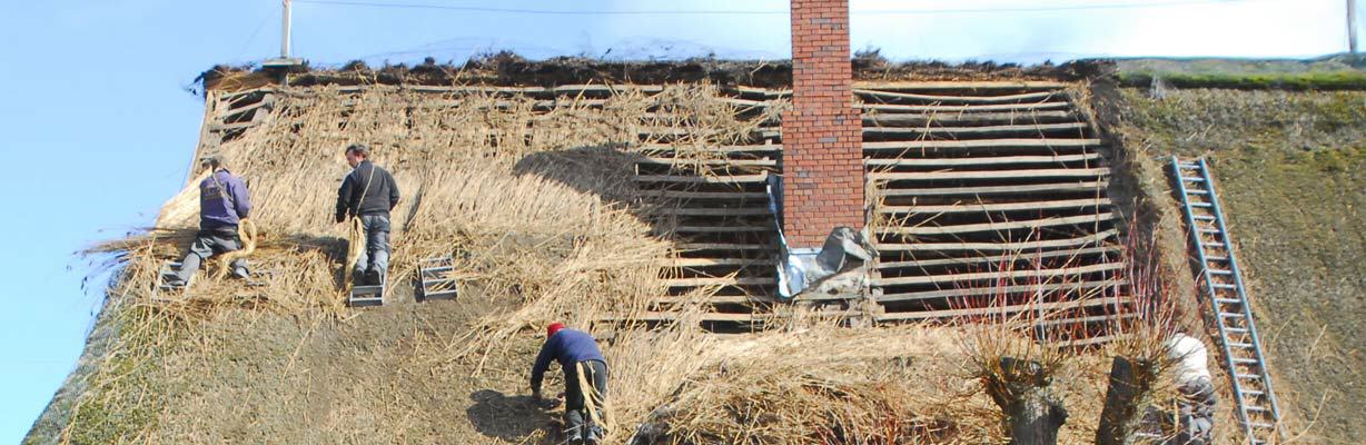Das Reetdach über dem Saal des Haselauer Landhauses wurde von Moos gesäubert und mit Reet nachgestopft. Der First wurde mit Heidekreut neu gearbeitet. Das Dach des Haselauer Landhauses erstrahlt im neuen Glanz.