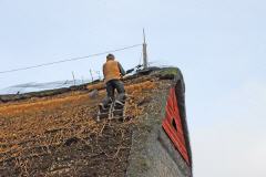 Hier soll das Reetdach vom Haselauer Landhaus neu eingedeckt werden. Dafür muss zunächst das alte Reet vom Dach genommen werden.