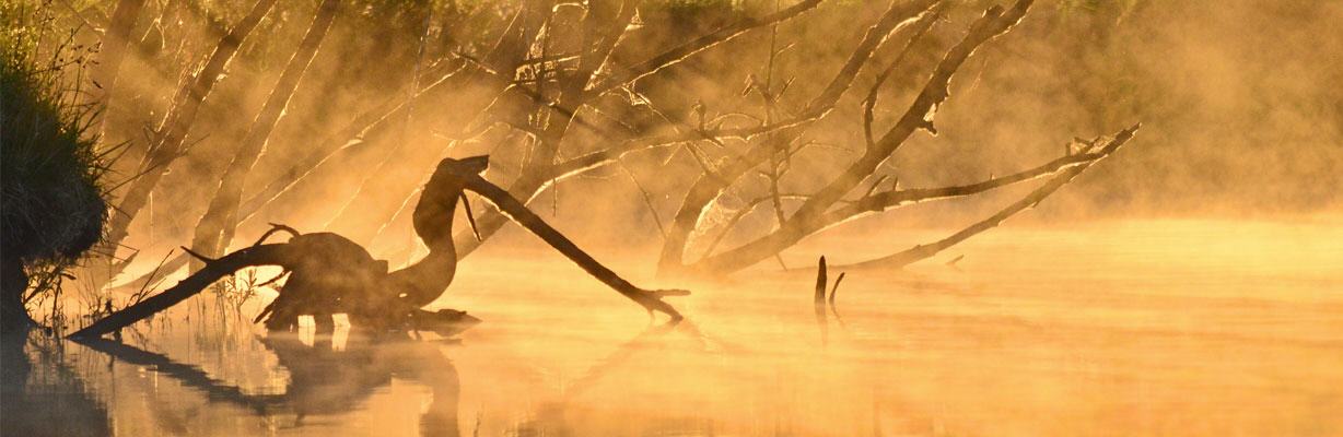 An den Ufern der Binnenelbe und an den Teichen in Scholenfleth sehen manche korrigen Wurzeln der Uferweiden im Frühnebel wie Fabeltiere aus.