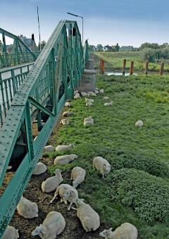 Das Foto zeigt ein Panorama von den Brückenbauarbeiten. Von Anfang Februar bis Ende Mai 2016 musste die Drehbrücke umfangreich saniert werden. Die den Straßenbelag bildenden Holzbohlen wurden aufgearbeitet oder ganz erneuert, die Korrosion an der Stahlkonstruktion wurde beseitigt. Die Bewohner der Marsch mussten dreieinhalb Monate lang kilometerlange Umwege erdulden.