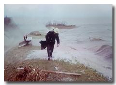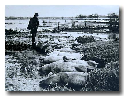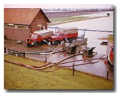 Die Feuerwehr rettet ein Reh vor dem Ertrinken während der Flutkatastrophe 1976 - 700 andere Rehe ertrinken sowie 3000 Fasanen und 1000 Hasen. Die Haseldorfer Marsch ist nach einem Deichbruch mit Wasser vollgelaufen. Wo die Feuerwehr hier steht, war früher die Altendeicher Chaussee und Wiesen dahinter.. Jetzt sieht man nur noch Wasser fast bis zum Horizont.