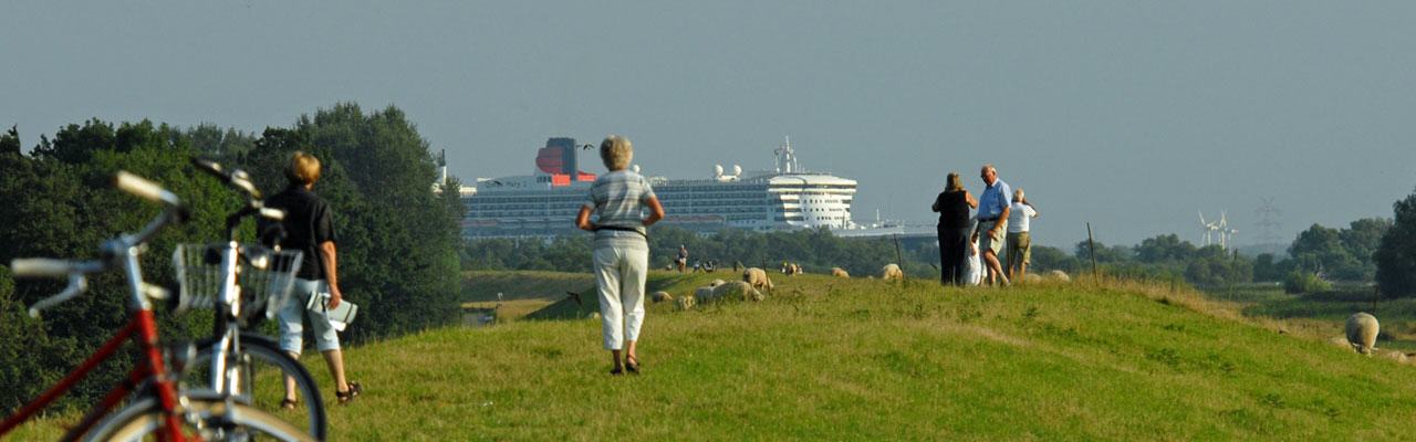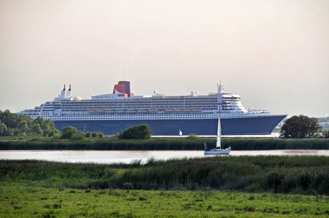 Die Queen Mary 2 fährt am Haselauer Kreuzdeich elbabwärts vorüber.