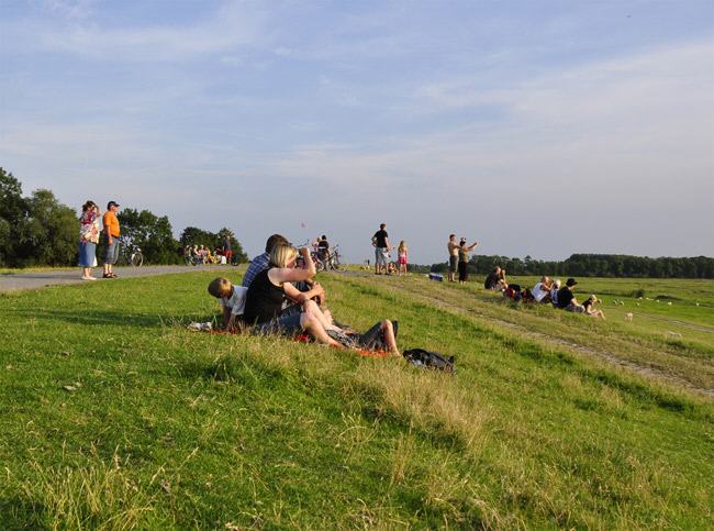 Am Deich haben sich einige Zuschauer eingefunden, die den beeindruckenden Anblick des schönen Schiffes genießen.