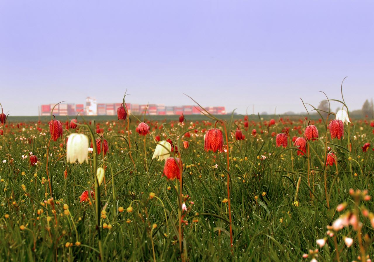 Schachblumenwiese in Hetlingen, im Hintergrund der Hof Giesensand.